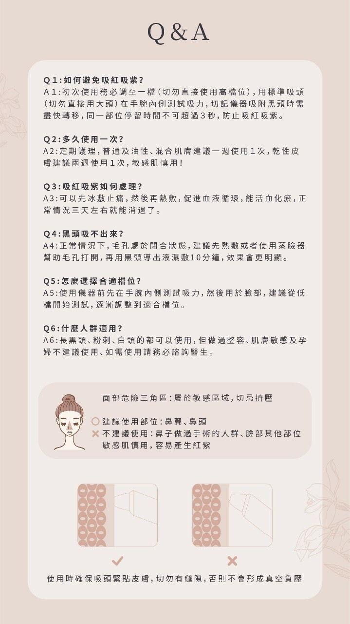 因為粉刺機的概念很像真空吸除的感覺,所以在過程中吸頭部位肌膚會發紅是正常的喲~