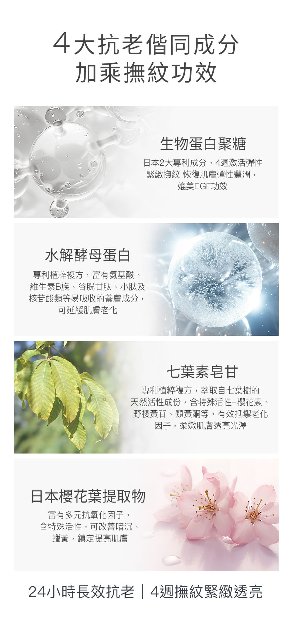 ◼4大抗老傳奇經典成分:日本生物蛋白聚糖、法國水解酵母蛋白、法國七葉素皂甘、日本櫻花葉提取物