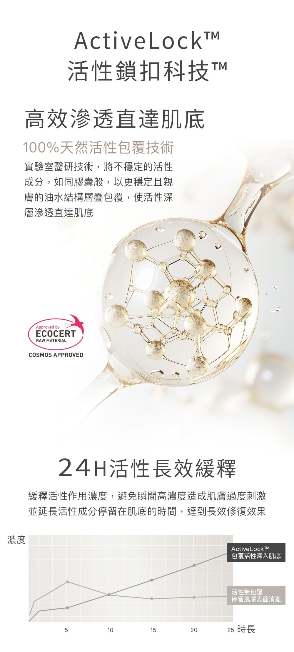◼採ActiveLock™活性鎖扣科技™封存活性,運用高能脂質構建超導系統,使活性能全面深層滲透肌底、24H長效溫和緩釋